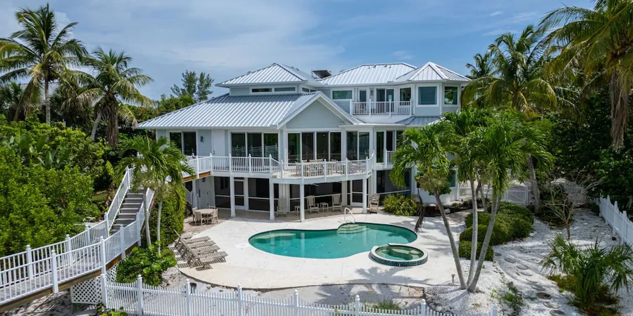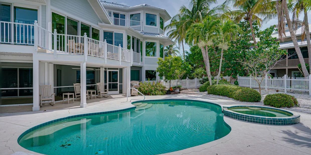 The 5 Bedroom, 4.5 Bath House has a total of 15 rooms in an open floorplan overlooking 100+ feet of private white sand beach, a dock with 2 boat lifts, and a heated pool and hot tub. The landscaping is primarily edible tropical fruits and berries for guests to enjoy.